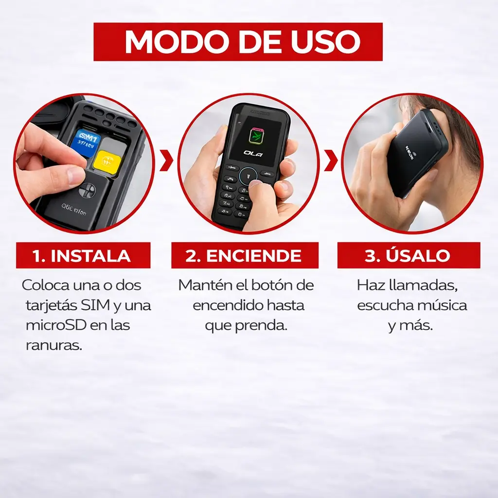 Inserta la(s) tarjeta(s) SIM y la batería Enciende el dispositivo Usa el teclado para realizar llamadas o enviar mensajes Accede al menú para utilizar radio, cámara o linterna Ajusta volumen y configuraciones según necesidad