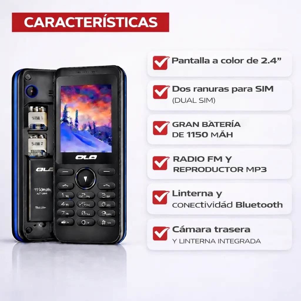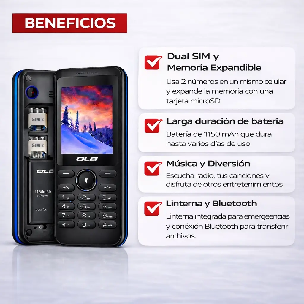 El celular Ola OK X36 es una excelente opción para quienes buscan un equipo sencillo, práctico y confiable para el uso diario. Diseñado para facilitar la comunicación, combina funciones básicas con un manejo intuitivo, ideal como teléfono principal básico o equipo de respaldo.