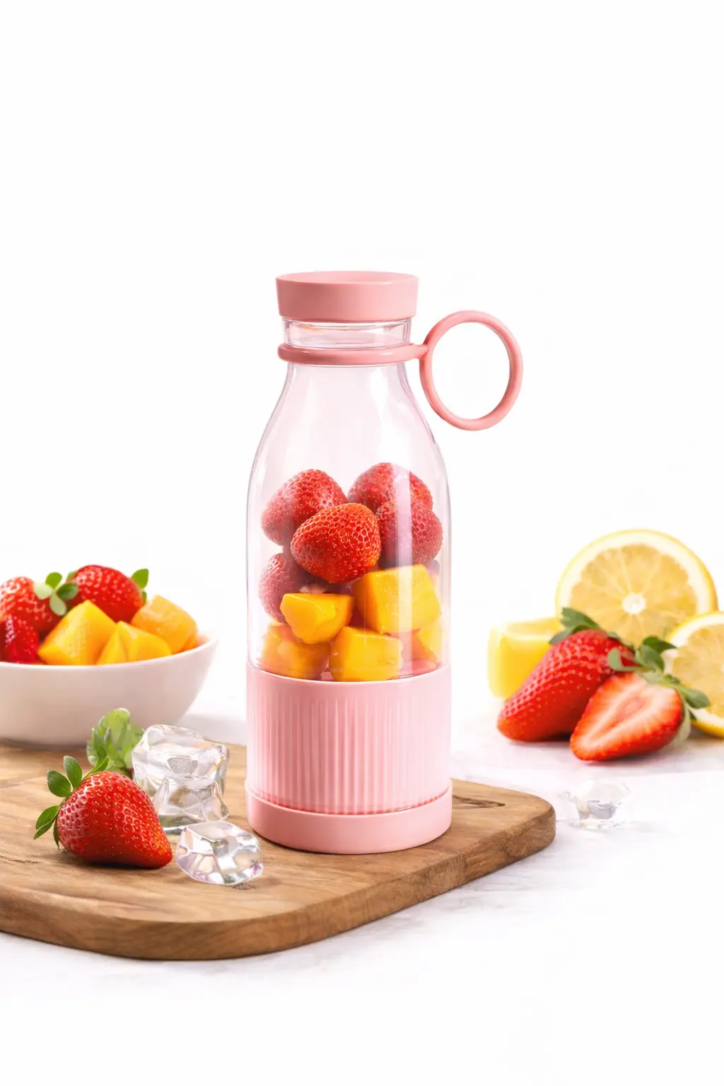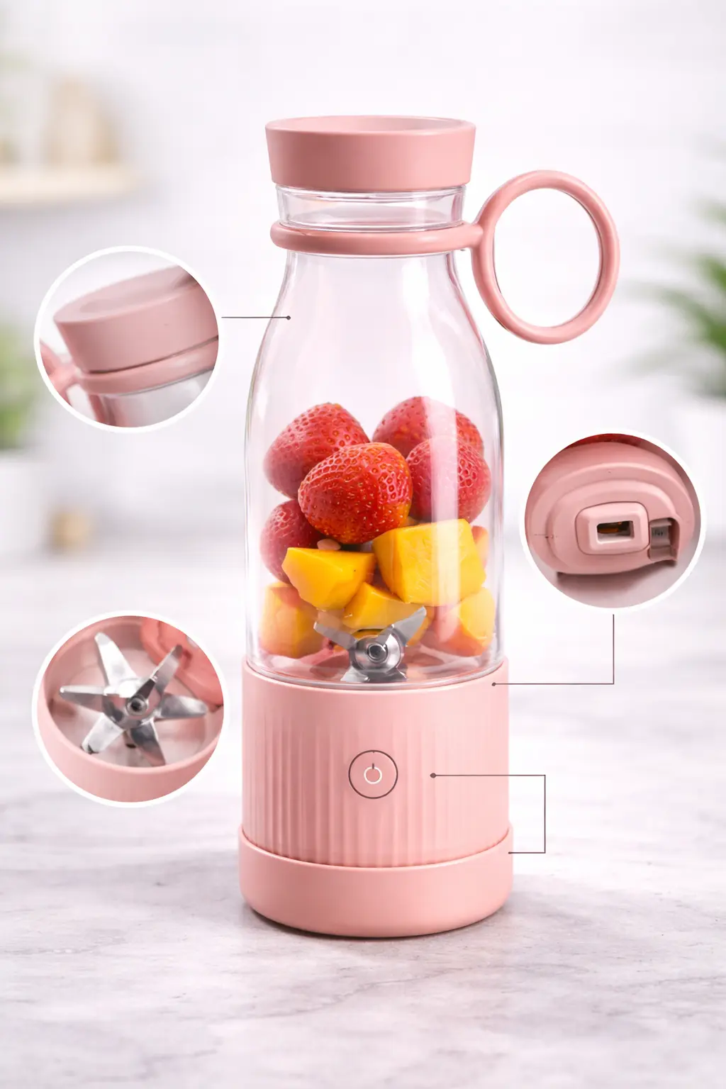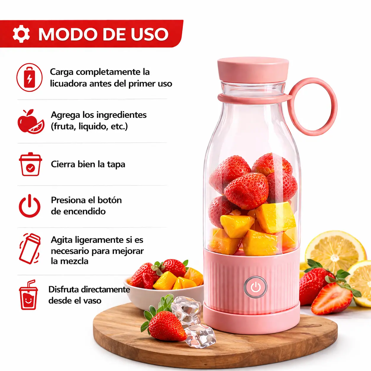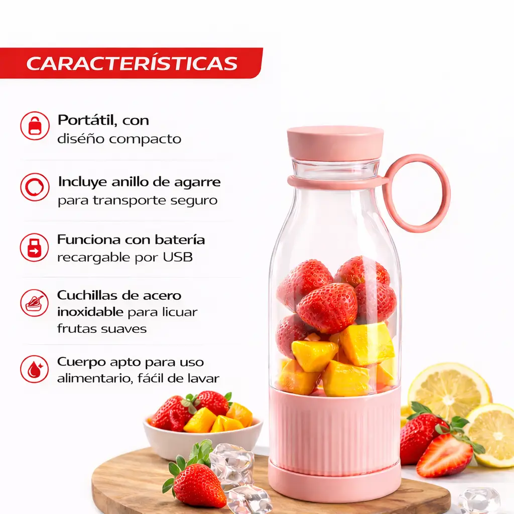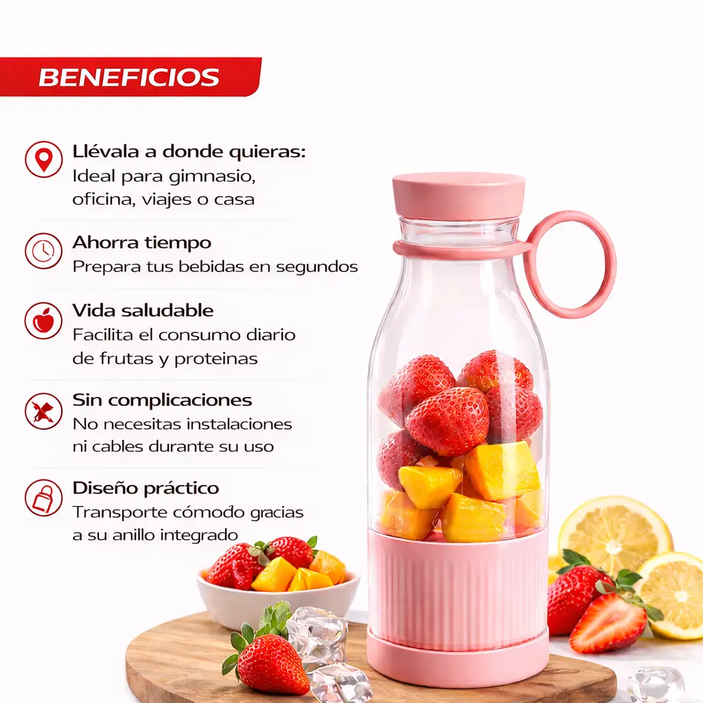 Llévala a donde quieras: Ideal para gimnasio, oficina, viajes o casa Ahorra tiempo: Prepara tus bebidas en segundos Vida saludable: Facilita el consumo diario de frutas y proteínas Sin complicaciones: No necesitas instalaciones ni cables durante su uso Diseño práctico: Transporte cómodo gracias a su anillo integrado